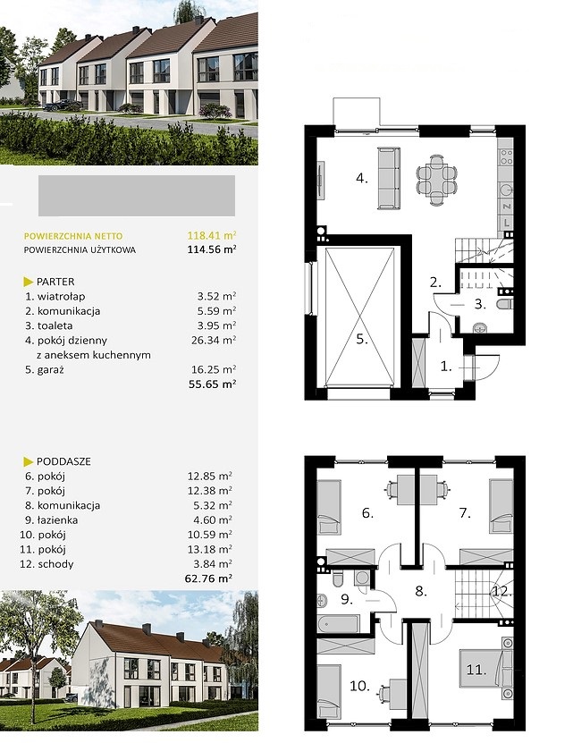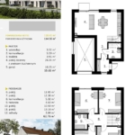 · parter: wiatrołap – 3,52 m2, komunikacja – 5,59 m2, pokój dzienny z aneksem kuchennym 26,34 m2, toaleta – 3,95 m2, garaż – 16,25m2